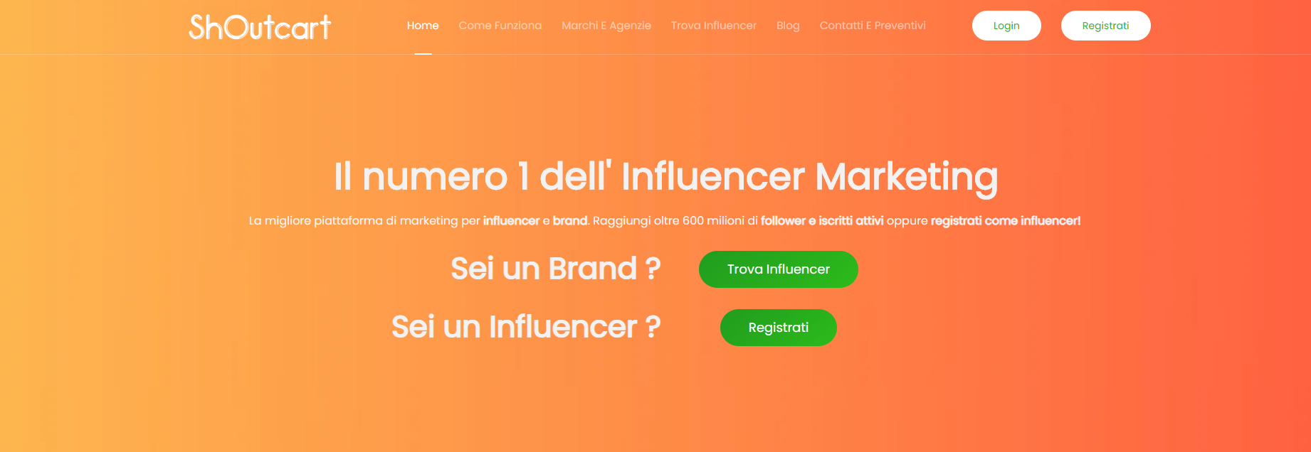 Shoutcart.it è il primo marketplace italiano specializzato nel marketing degli influencer, il cui scopo è quello di mettere in contatto gli account personali e aziendali con gli influencer. La piattaforma permette agli influencer e alle aziende di iscriversi e di guadagnare, nel primo caso dei soldi, nel secondo, follower e visibilità per i prodotti e/o i servizi.